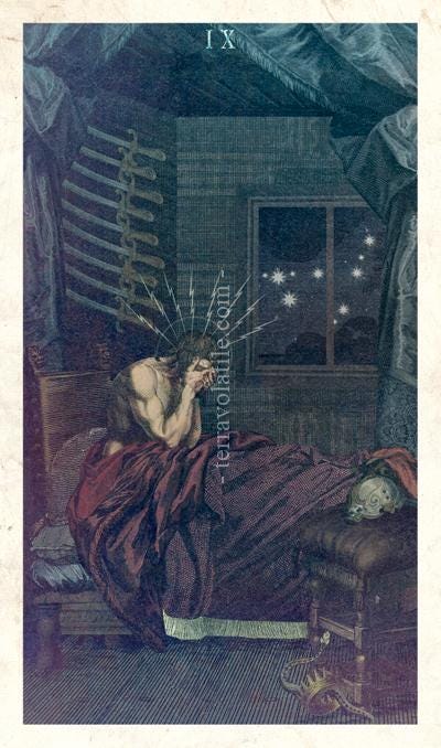 How the IX of Swords represents the archetypal dark night of the soul along with its mythic counterparts