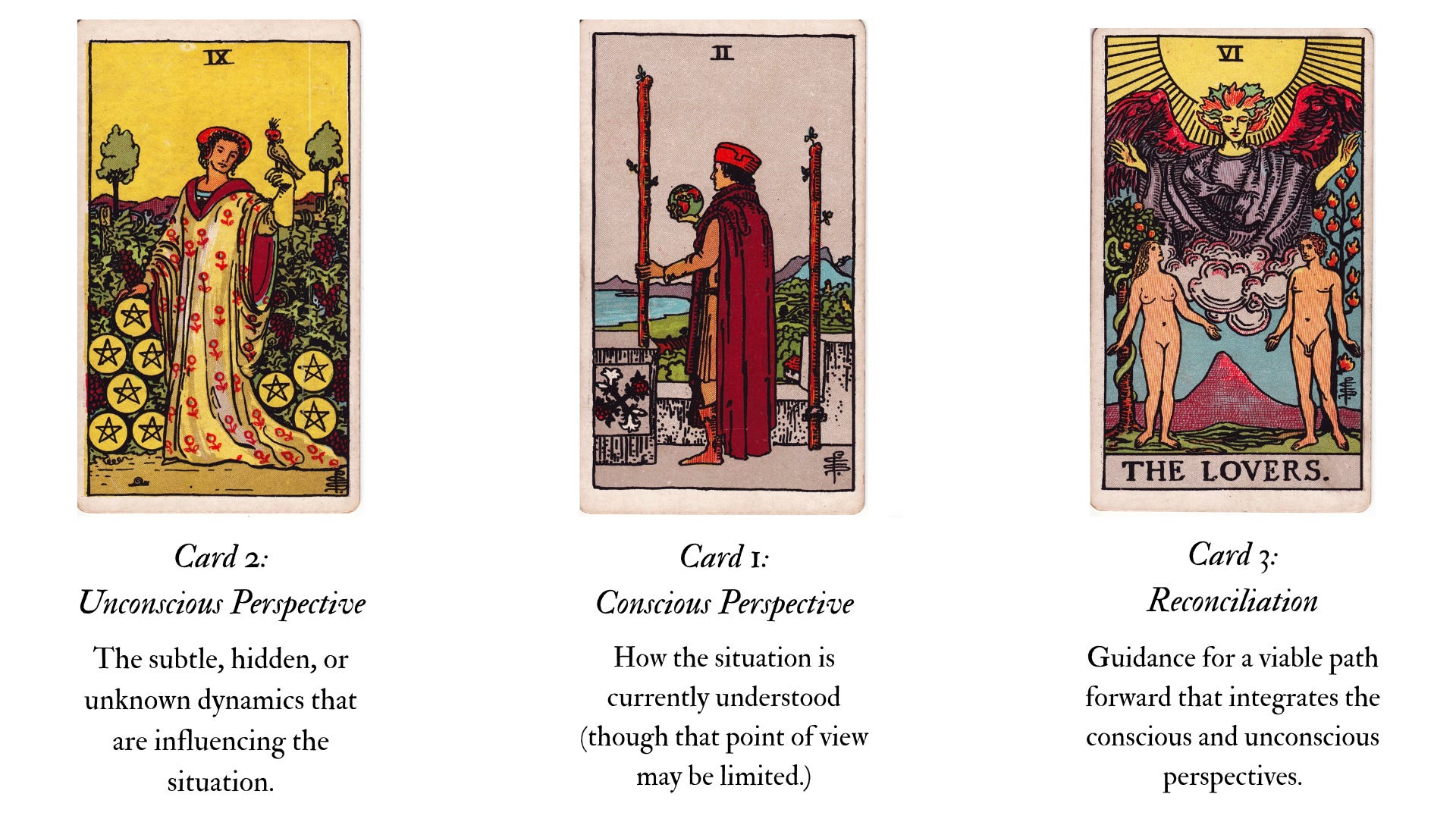 Here are the cards drawn for the reading! As you work on interpretation, consider each card (individually and together) as it relates back to the question and situation. Although the cards have fairly established meanings, they tend to shift and emphasize certain nuances depending on the reading.